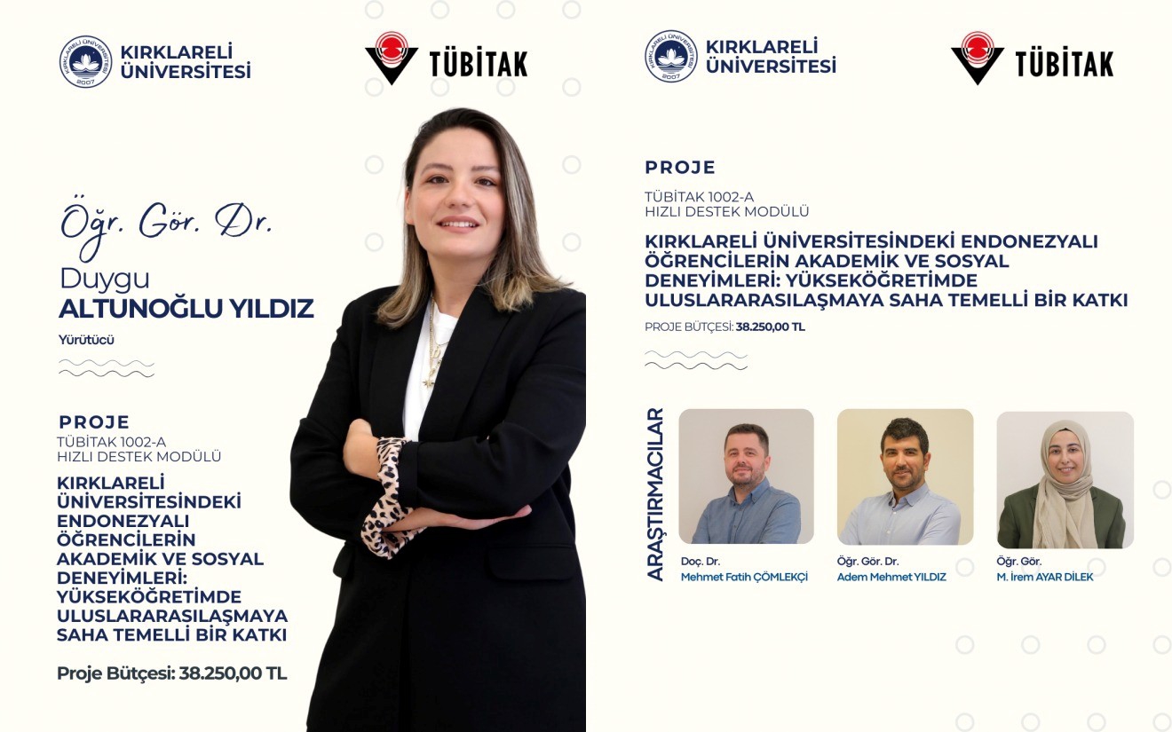 Görsel-İşitsel Teknikler ve Medya Yapımcılığı Bölümü öğretim üyesi Doç. Dr. Mehmet Fatih ÇÖMLEKÇİ’nin araştırmacıları arasında olduğu ve Öğr. Gör. Dr. Duygu ALTUNOĞLU YILDIZ’ın yürütücülüğünü yaptığı “Kırklareli Üniversitesindeki Endonezyalı Öğrencilerin Akademik ve Sosyal Deneyimleri: Yükseköğretimde Uluslararasılaşmaya Saha Temelli Bir Katkı” başlıklı araştırma projesi TÜBİTAK 1002-A Hızlı Destek Modülü kapsamında desteklenmeye hak kazanmıştır. Proje araştırmacıları arasında üniversitemiz personeli Öğr. Gör. Dr. Adem Mehmet YILDIZ ve Öğr. Gör. M. İrem AYAR DİLEK de bulunmaktadır.