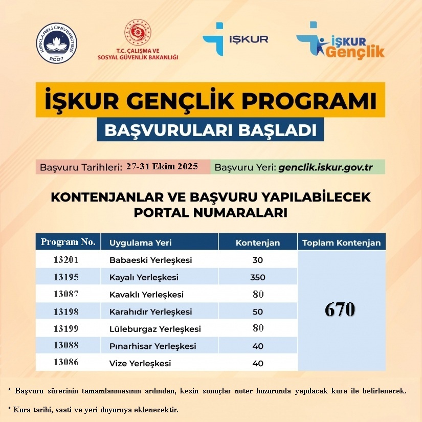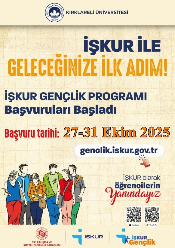 İŞKUR Gençlik Programı başvuruları başlamış olup, başvurular 27-31 Ekim 2025 tarihleri arasında yapılacaktır.