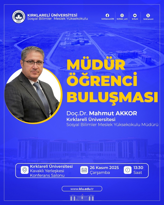 Etkinlik, 26 Kasım 2025 Çarşamba günü saat 13.30’da, Kavaklı Yerleşkesi Konferans Salonu’nda, Sosyal Bilimler Meslek Yüksekokulu Müdürü Doç. Dr. Mahmut Akkor’un katılımıyla gerçekleştirilecektir.