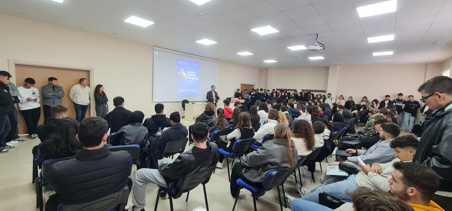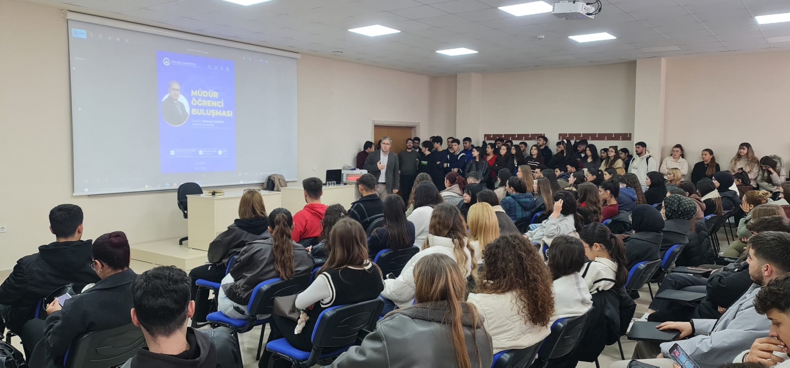 26 Kasım 2025-Çarşamba günü Kavaklı Yerleşkesi Konferans Salonu’nda, Yüksekokulumuz Müdürü DoçDr. Mahmut AKKOR, Müdür Yardımcılarımız Öğr.Gör. Yakup AKPINAR ve Öğr.Gör. Ata KAFADAR, Yüksekokul Sekreterimiz Alaattin YERLİKAYA ile öğrenci işleri personelimiz Yunus TUNÇ’un katılımları ile “Müdür-Öğrenci Buluşması” düzenlenmiştir.