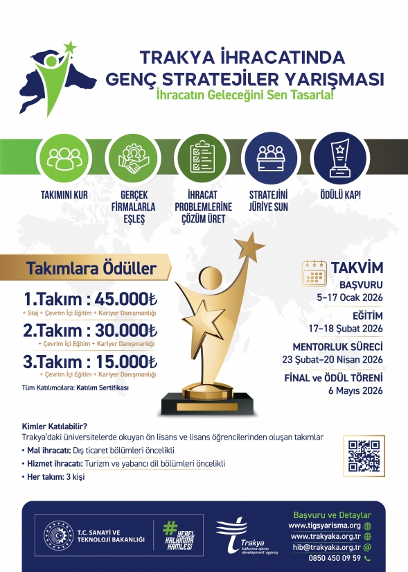 Trakya Kalkınma Ajansı tarafından 2026 yılında TR 21 Düzey 2 Bölgesi'ndeki üniversitelerde öğrenim gören öğrencilere yönelik düzenlenecek "Trakya İhracatında Genç Stratejiler" isimli yarışma kapsamında; öğretim üyeleriyle iş birliği içerisinde 'Trakya Kalkınma Ajansı Trakya İhracatında Genç Stratejiler Yarışması düzenlenecektir.